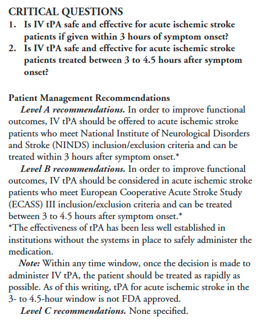 - Level B recommendation for tPA administration between 3 and 4.5 hours is too high cause is supported just by 1 Class II study (ECASS III) and a bunch of Class III evidences.
