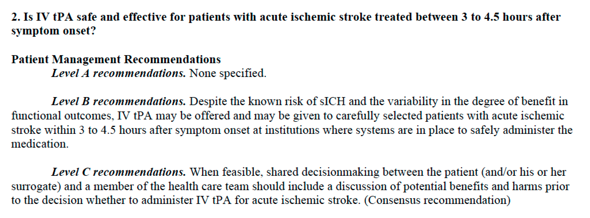 - The authors in their final statement play with terms jumping between “should be offered and may be given” and “selected patients” for 3 hours treatment to “may be given” and “carefully selected patients”for the 3 to 4.5 hours treatment, to emphasize the difference between recommendations both graded as Level B but supported by such a different quality of evidences. These leave to clinician a wide margin of discretionality (“may be given” but also “may be not”) supporting them in their choices (whatever it is, and that is good), but from the other hand not giving a clear advice or any clinical tool to help the decision making process. This gonna result in a large variability of approach.