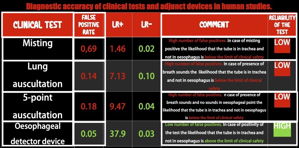 The available data strongly suggest that clinical signs lack the discriminatory power to exclude oesophageal intubation to a sufficient degree to ensure patient safety when capnography is not available or doubted. The oesophageal detector device performs better than clinical examination, and in resource-limited environments with no access to capnography, may be sufficiently sensitive and specific to help guide decision-making.