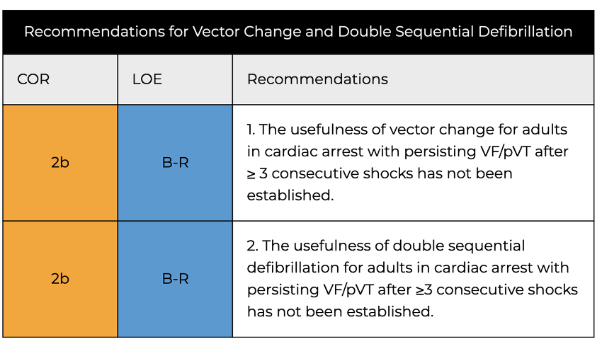 Previously ILCOR stated about the same topic: We suggest that a double sequential defibrillation strategy (weak recommendation, low certainty of evidence) or a vector change defibrillation strategy (weak recommendation, very low certainty of evidence) may be considered for adults with cardiac arrest who remain in ventricular fibrillation or pulseless ventricular tachycardia after 3 or more consecutive shocks.